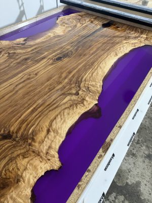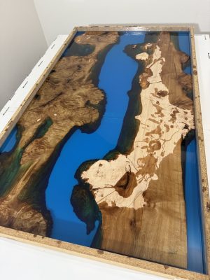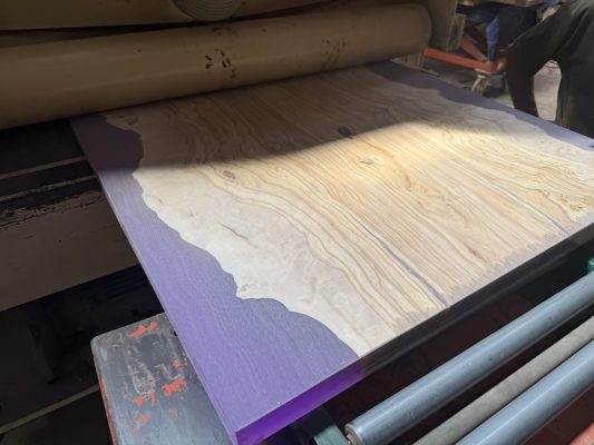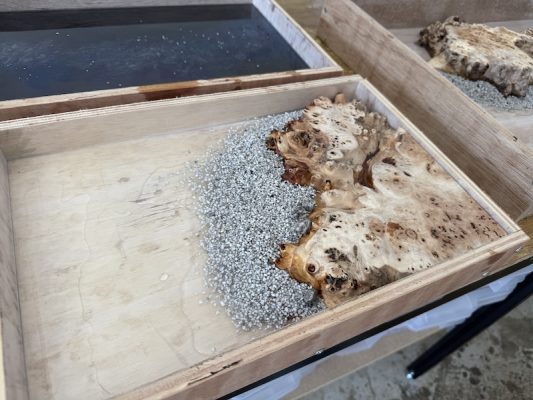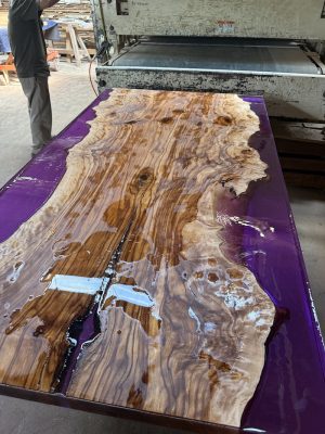 レジン向きの強い動きではありませんが、上品な動きがあり、最上級の縮み杢のでた一枚板をクリアレジンで高級感を増して行きます。