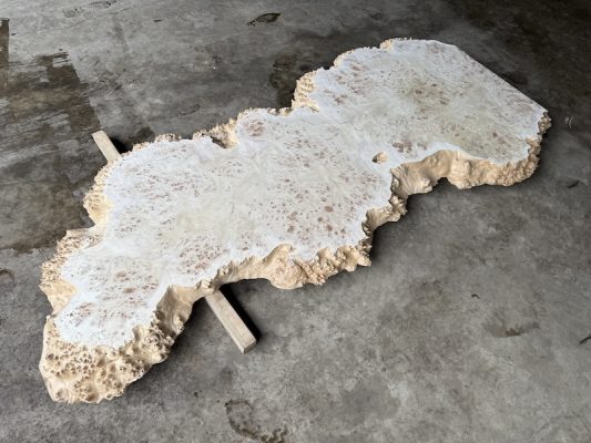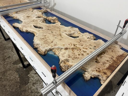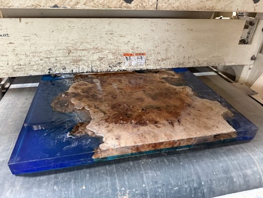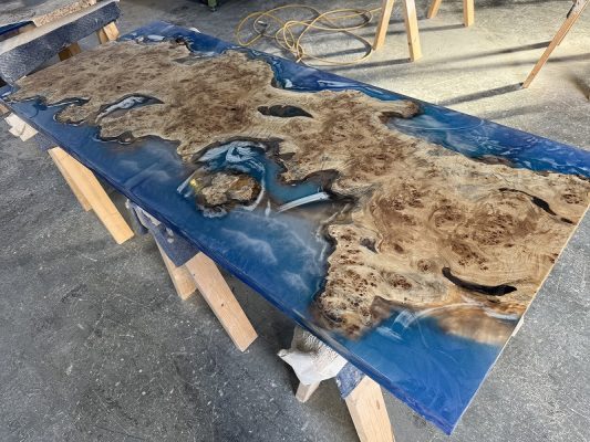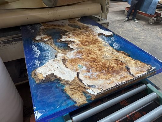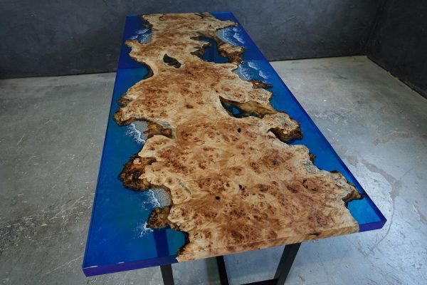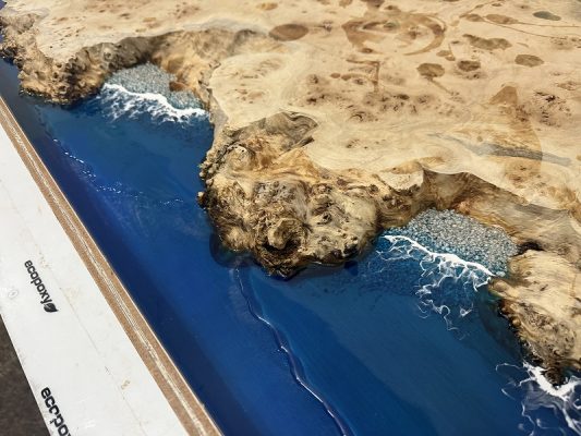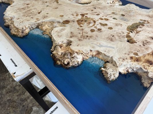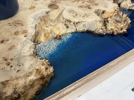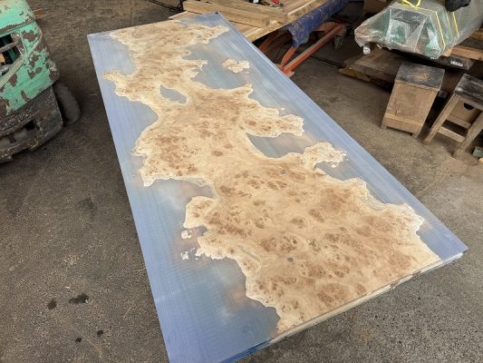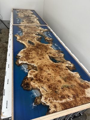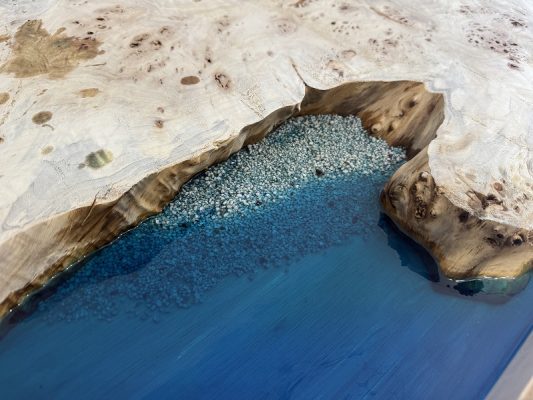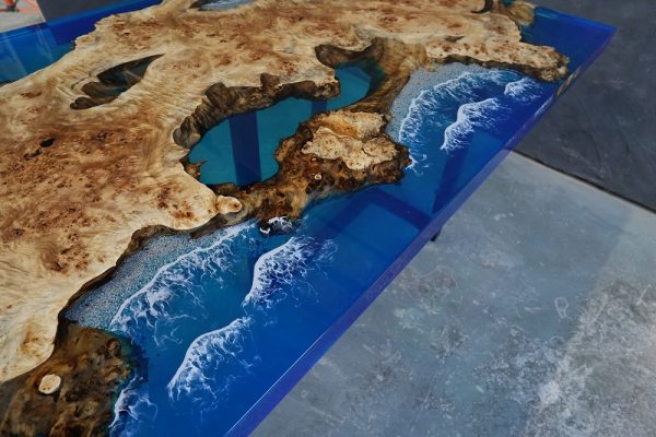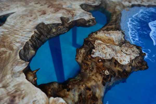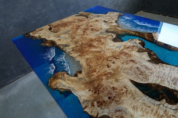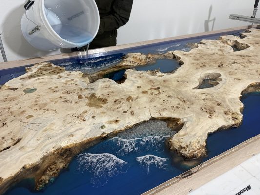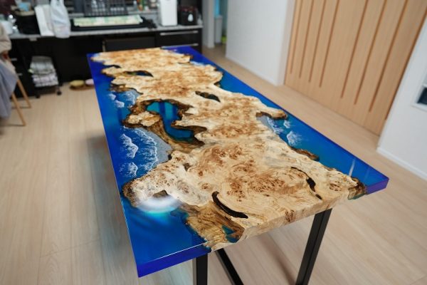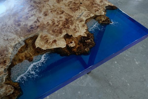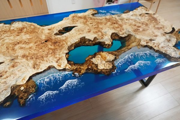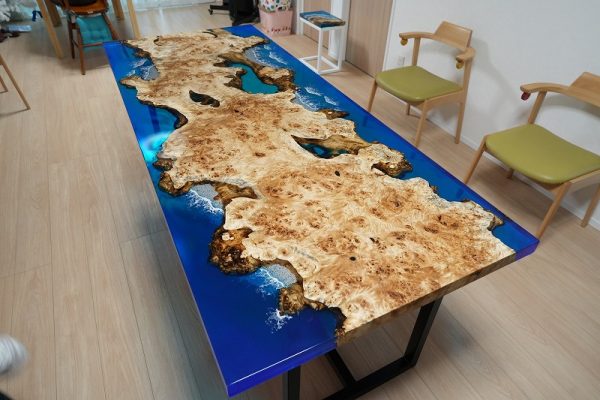 自然の荒々しい一枚板の在庫数千枚 × 500枚以上を製作してきたデザイナーとの倉庫でのオーダー × レジンで海を高いレベルで演出する技術