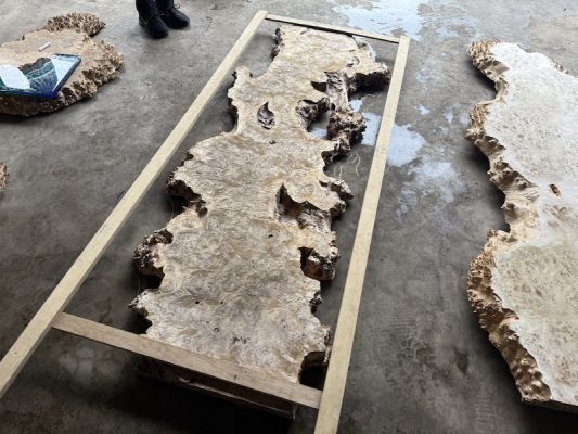 ご希望内容はポプラを使用したレジンテーブルを探して倉庫見学いただきました。