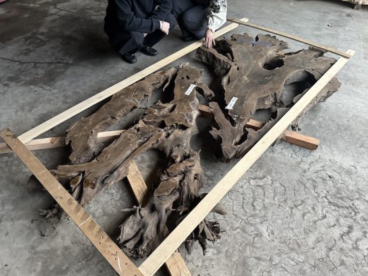 本日は持ち込み一枚板のレジンテーブルの制作の様子をご紹介させていただきます。 本日ご紹介の持ち込みいただいた一枚板はこちら! お預かりしてデザイン配置した写真ですが、特徴的なミズナラの一枚板です。 お客様は山梨県の方で、 …